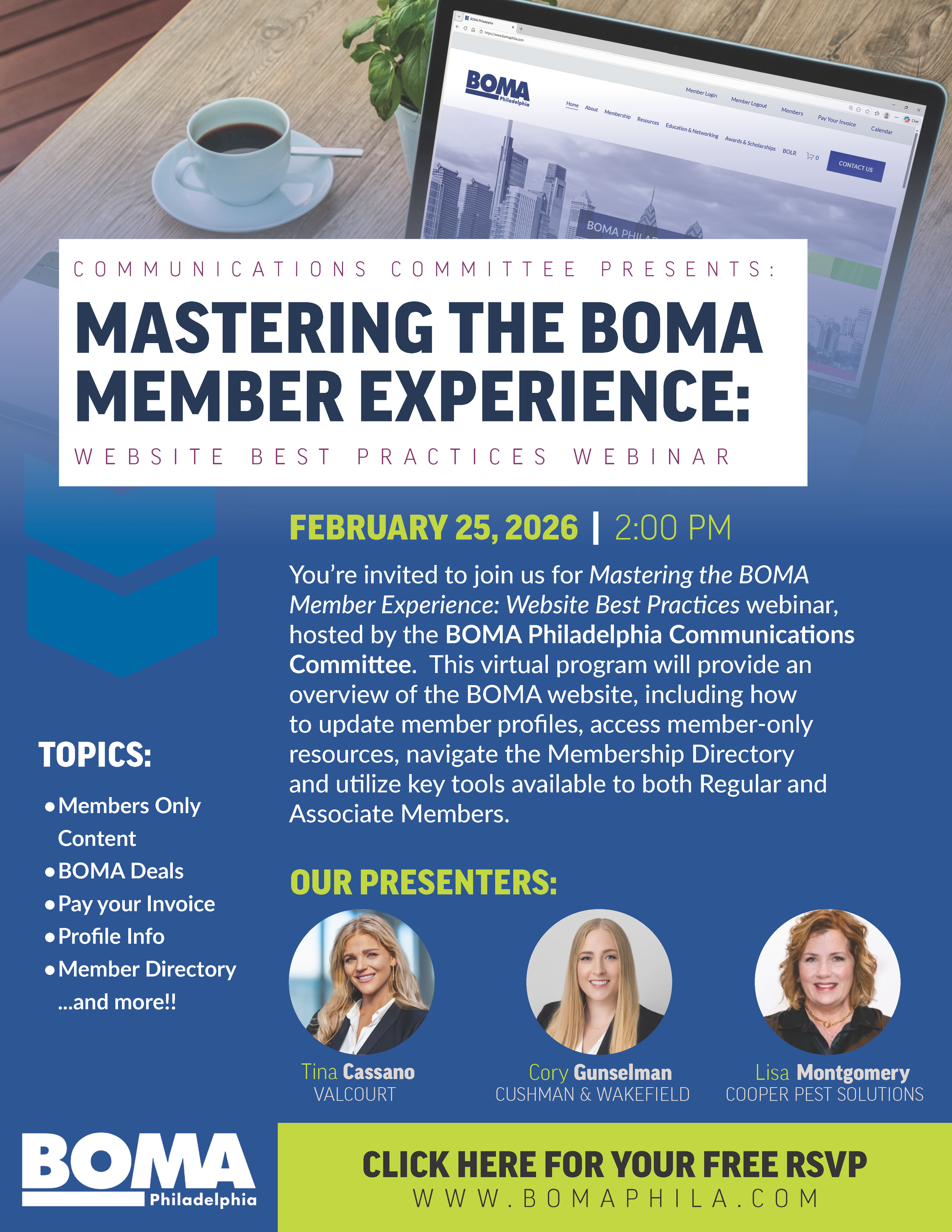 You’re invited to join us for Mastering the BOMA Member Experience:Website Best Practices Webinar, hosted by the BOMA Communications Committee. This virtual program will provide an overview of the BOMA website, including how to update member profiles, access member‑only resources, navigate the Membership Directory, and utilize key tools available to both Regular and Associate Members.
